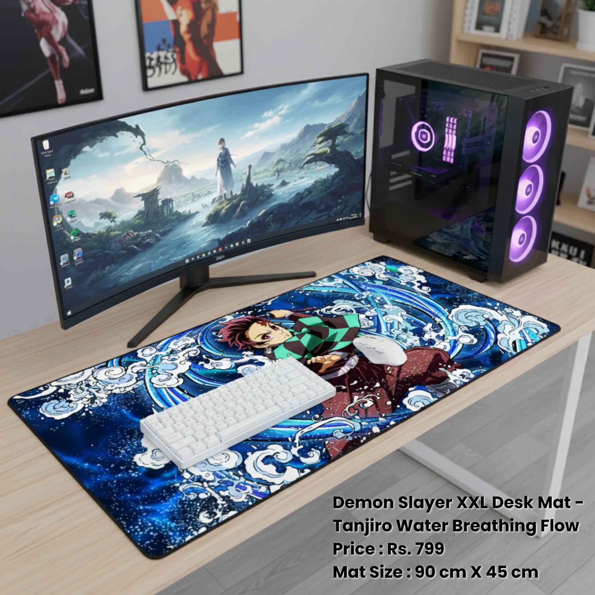 Immerse yourself in the fluid movements of Tanjiro's Water Breathing with this captivating XXL (90cm x 45cm) desk mat. Inspired by his growth throughout the Demon Slayer journey leading to the Infinity Castle, this mat offers a smooth glide and a stable 3mm anti-skid base.Give a premium feel to your table.