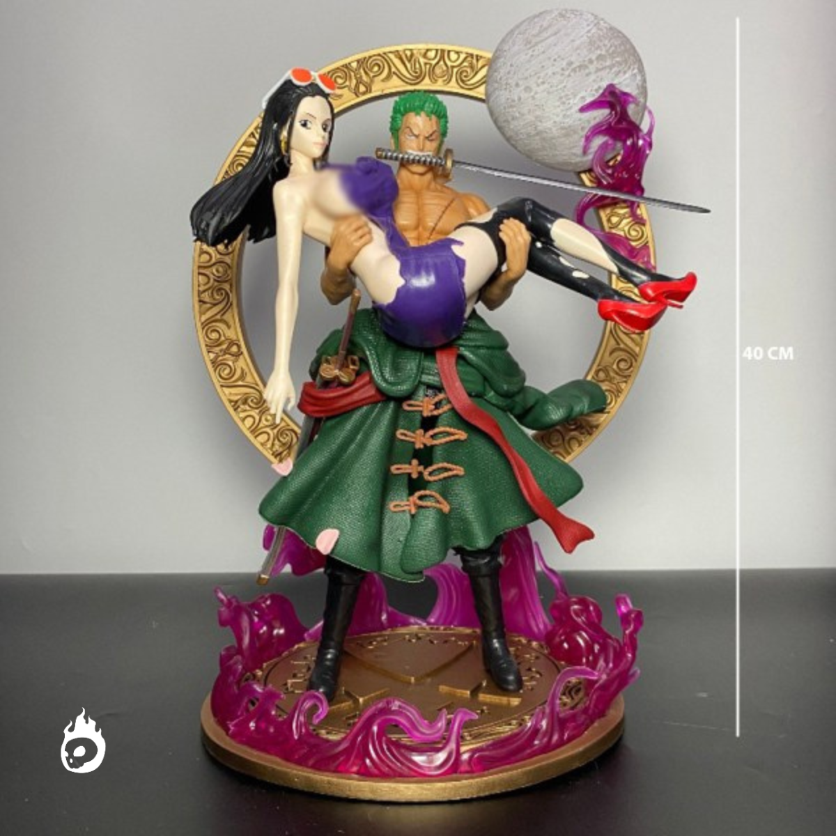 Witness the bond of the Straw Hat Pirates with our Premium Roronoa Zoro and Nico Robin Team-Up Figurine from One Piece. This stunning 40cm statue depicts Zoro carrying Robin, showcasing their unique dynamic. The intricate detailing of their attire, the powerful presence of Zoro, and the elegant pose of Robin make this a captivating piece for any One Piece collector. The detailed base with swirling effects further enhances this memorable scene.